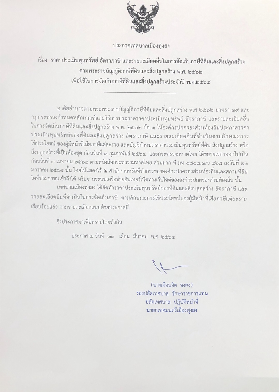 ราคาประเมินทุนทรัพย์ อัตราภาษี และรายละเอียดอื่นในการจัดเก็บภาษีที่ดินและสิ่งปลูกสร้าง